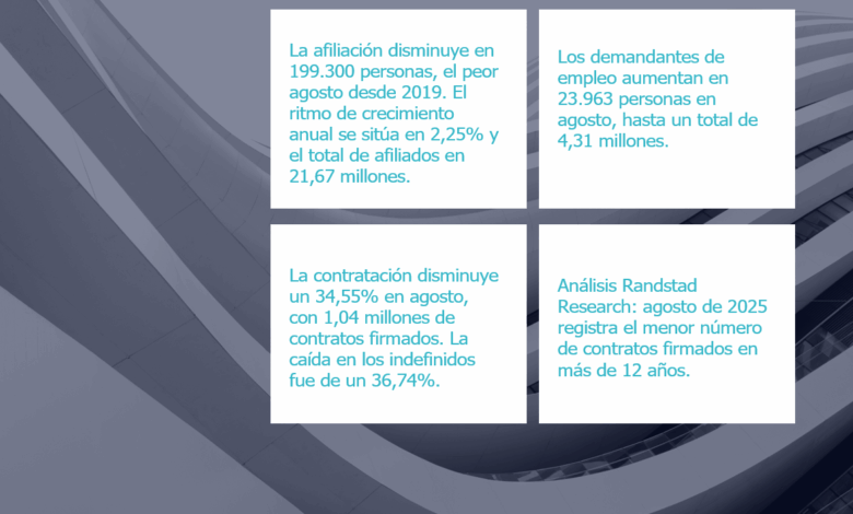 La afiliación a la Seguridad Social en agosto descendió en 199.300 personas, un decremento de un 0,91%, lo que supone el peor comportamiento de esta serie desde 2019. El crecimiento interanual del empleo se desacelera 1 centésima, hasta un 2,25%. La cifra total de afiliados queda situada en los 21,67 millones de personas.