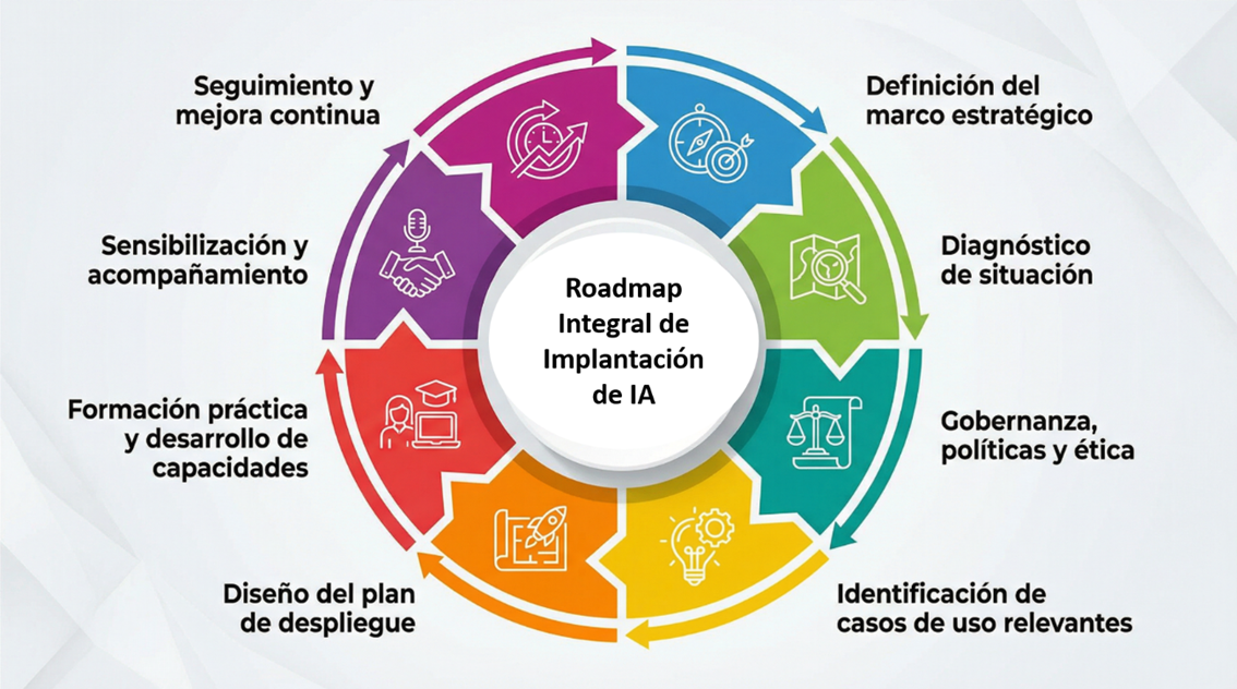 8. Seguimiento y mejora continua. Medición constante, corrección de desviaciones, ajuste de casos de uso y adaptación progresiva a medida que la tecnología evoluciona.