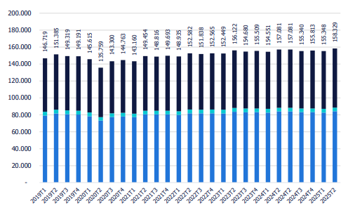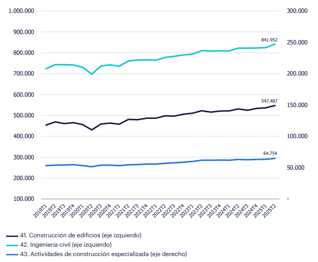 Analizando las empresas, el sector de Construcción cuenta con 158.329 empresas, de las cuales el 53% pertenece a Actividades de construcción especializada. En el segundo trimestre de 2025, el número de empresas en Construcción de edificios creció un 1,6% interanualmente, mientras que en los otros segmentos decreció un 0,2%. El tamaño medio de las empresas (medido por el número de asalariados) en Actividades de construcción especializada y Construcción de edificios se ha mantenido constante, mientras que en Ingeniería civil ha aumentado ligeramente en los últimos años.