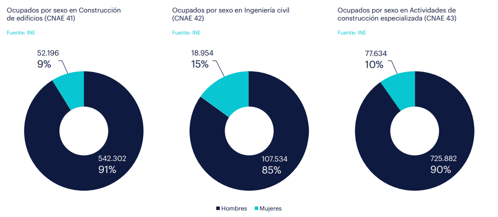 Las cifras reflejan que las mujeres representan solamente un 9,8% del total, una cifra muy por debajo del promedio nacional. La proporción de hombres y mujeres es muy similar en los segmentos de Construcción de edificios y Actividades de construcción especializada, mientras que el empleo femenino tiene un poco más de peso en Ingeniería civil, donde alcanza el 15%.