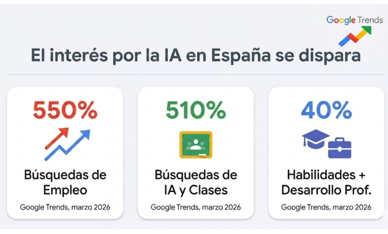 La tendencia es clara: los ciudadanos buscan activamente adquirir nuevas competencias tecnológicas para asegurar su competitividad en el entorno laboral y los estudiantes están recurriendo a las herramientas de IA más que nunca para recibir ayuda con sus tareas y estudios. Así lo confirman los últimos datos de la Búsqueda de Google en España correspondientes a marzo de 2026, que revelan un cambio radical en la forma en que los usuarios afrontan su formación y su carrera profesional apoyándose en la Inteligencia Artificial (IA).