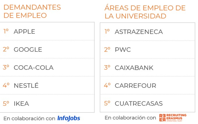 El ranking revela matices fascinantes según quién responda. En esta edición, como novedad, conocemos la opinión de los demandantes de empleo (gracias a la colaboración con Infojobs). Para ellos, Apple es la empresa más atractiva seguida de Google (2º) y Coca-Cola (3º). Por su parte. las Áreas de Empleo de las Universidades consideran a AstraZeneca como la compañía líder en fidelizar Talento, a la que siguen PWC (2º), Caixaban (3º).