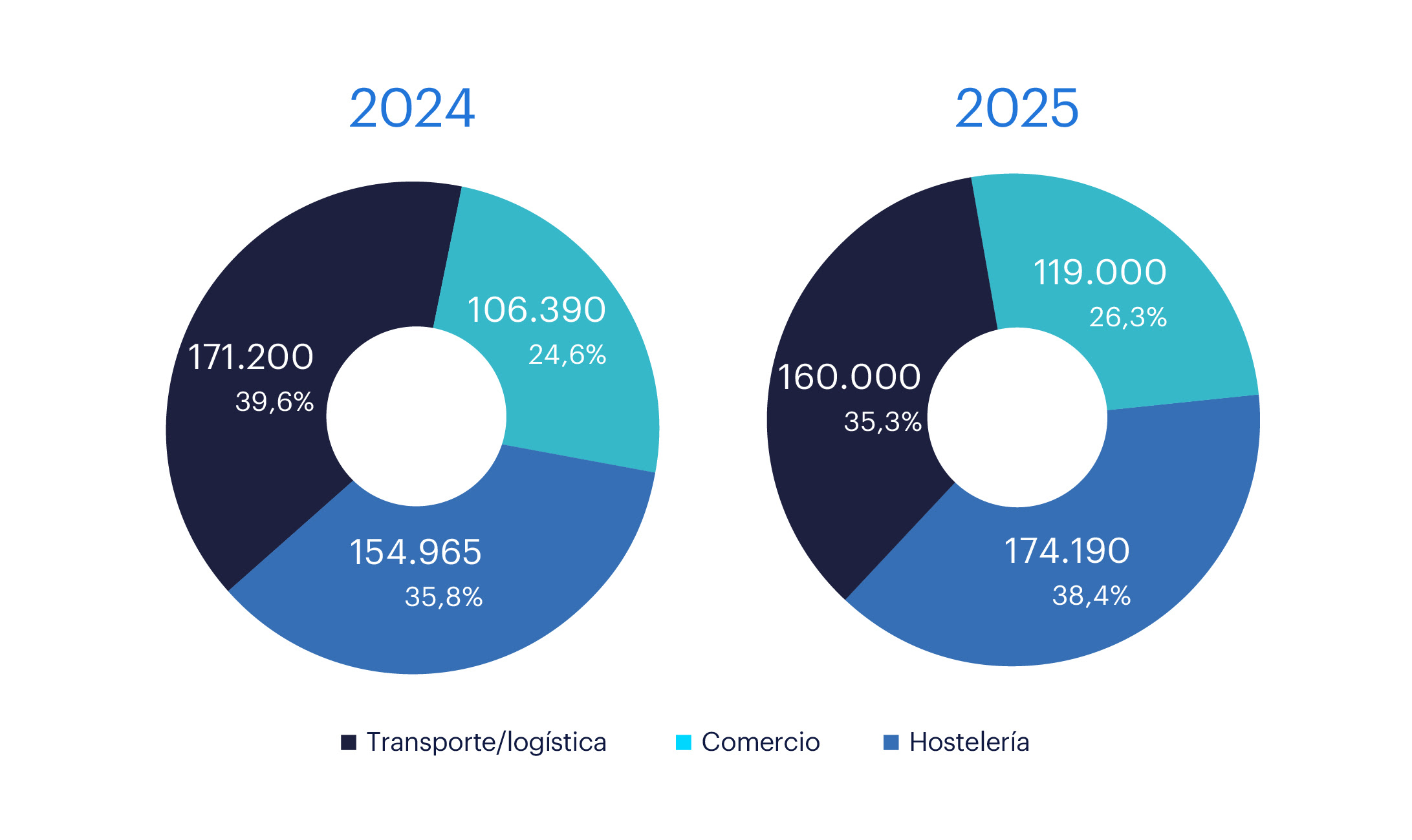 En lo que se refiere a sectores, la hostelería será el sector que más contratos va a generar (174.190) y el que más crecerá, un 12,4% respecto al año anterior cuando se cerraron 154.965. Por su parte, el transporte y la logística, uno de los sectores más beneficiados por estas fechas, registrará cerca de 160.000 contratos, un 6,8% menos que el año anterior (171.200). Y, finalmente, el comercio va a generar 119.000 contratos durante esta campaña, un 12,1% más que en 2024 (106.390). En cuanto al peso de los sectores, el transporte y la logística representan el 35,3% del total de vacantes, la hostelería un 38,4% y el comercio poco más del 26,3%.