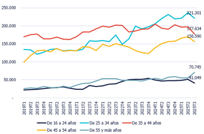 • El grupo de edad mayoritario fueron las personas de entre 25 y 34 años, con un total de 221.000 trabajadores.